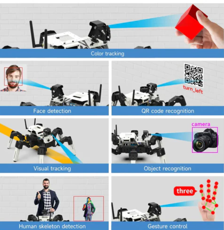 Muto is a desktop level biomimetic hexapod robot with an aluminum alloy body, 18PCS 35KG metal servos, and exquisite structural design that enables it to perform various simulated actions with astonishing flexibility and diversity. With the help of Raspberry Pi or Jetson Nano as the main controller, Muto can complete various functions such as color recognition, following, face tracking, QR code recognition, visual inspection, etc. through Python 3 programming. Users can control it through a mobile app, wireless controller, and computer web buttons, which can transmit real-time videos captured by the camera to their phone. Muto robots are an ideal companion for exploring technology, engineering, and programming.
