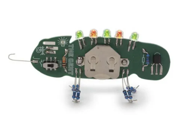 • The Gent Soldering Kit features a two-color color changing PCB that changes from blue to green. The Gent's "eyes" are phototransistors that register light. When light is "blind", the LED displays the color. This mesmerizing chameleon-shaped board glows in the dark. Solder it and admire the changes.