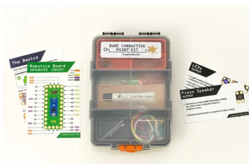 • Crazy Circuits Kit with Bare Conductive Paint combines the power of Arduino with the conductive paint from Crazy Circuits. The included Invent Board enables users to turn the included conductive paint into interactive programming projects. Create your own programs or use one of the many online guides or tutorials.