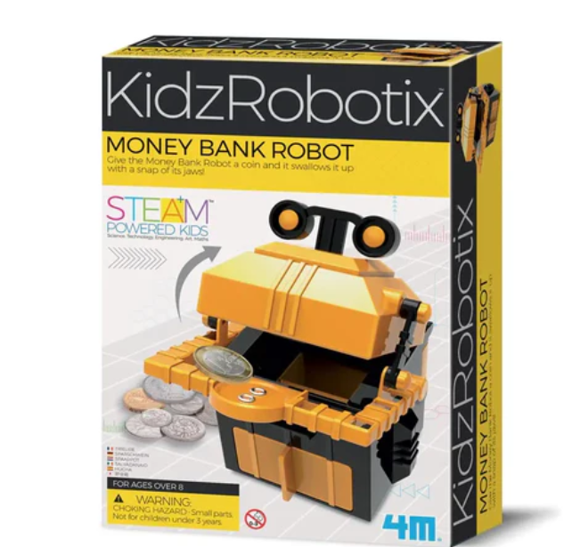 The 4M KidzRobotix piggy bank robot kit (in French) is an excellent automatic piggy bank robot. Its design allows coins to be placed on its arm and then it will swallow the coins. This feature is particularly attractive to children who like to deposit their pocket money into their own bank.
