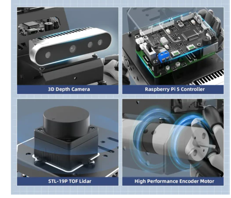 Equipped with advanced components such as closed-loop encoding motor, TOF LiDAR, 3D depth camera, high torque servo, etc., to ensure optimal performance