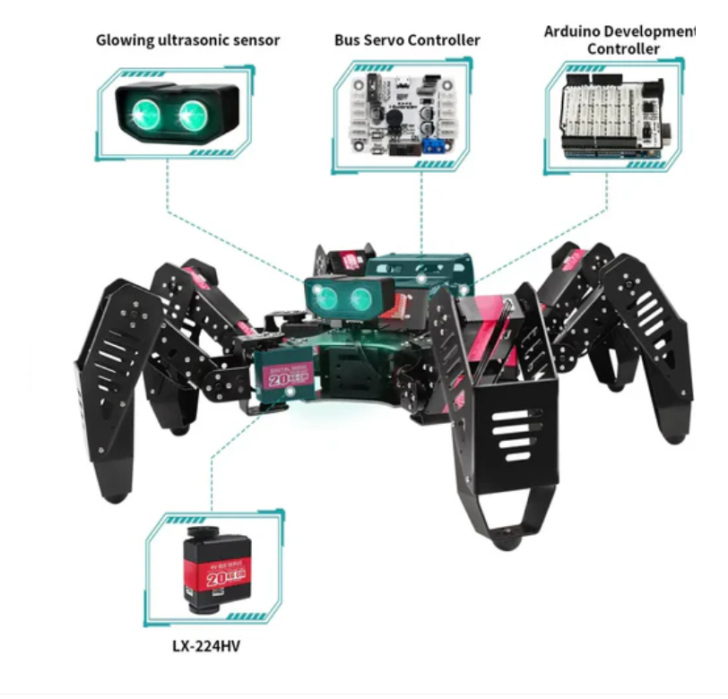 • The Hiwonder Spiderbot Hexapod Arduino programming robot is a programmable robot with 18 degrees of freedom (DOF). By using the provided Android/iOS applications, it is easy to program them to perform tasks such as walking, climbing, and dancing.