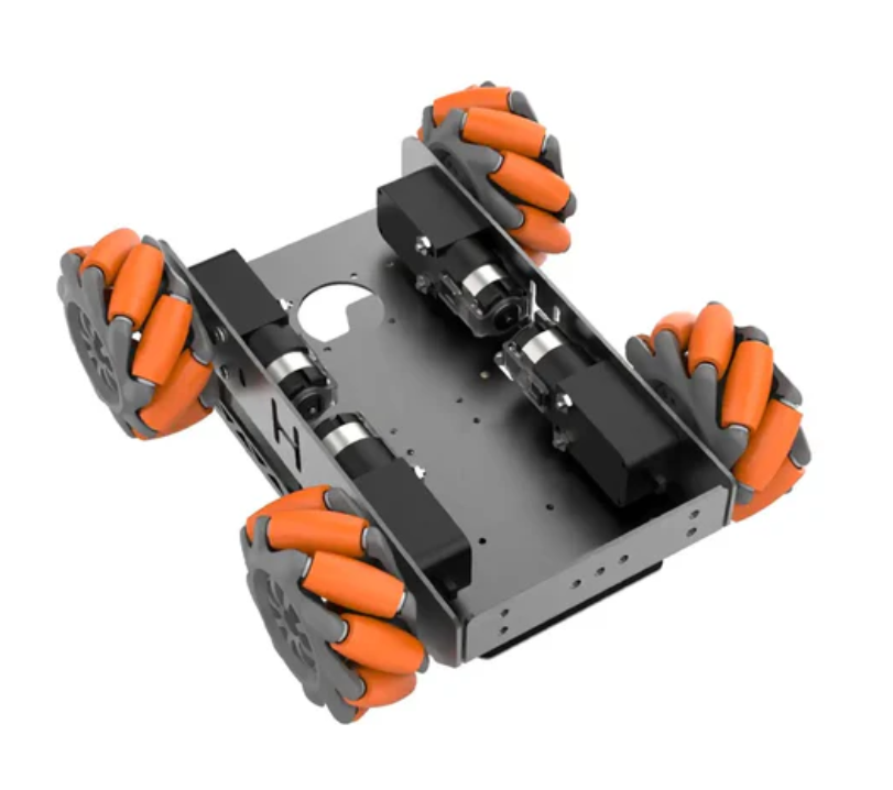Hiwonder mecanum chassis car kit with TT motor, aluminum alloy frame, suitable for DIY robot car, uses the latest mecanum wheels for mobility. The 4WD mecanum car chassis is equipped with universal wheels, which can move in any direction and drive smoothly in narrow spaces and rugged terrain.