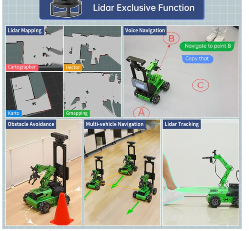 JetAuto Pro can achieve multi machine formation performances and artificial intelligence games through multi machine communication and navigation technology.