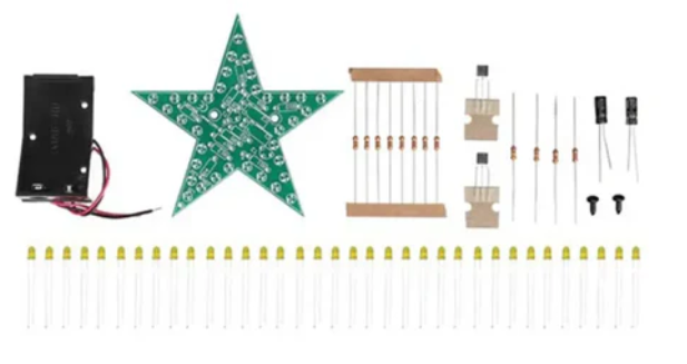 • The Yellow Flashing LED Star Soldering Kit has 35 yellow LEDs. It is powered by a 9V battery, so it is safe to use and increases the effectiveness of multiple kits. It can also be operated in a car (12V). You can choose to have it flash or stay on.