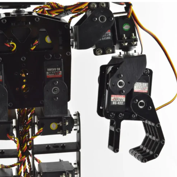 Lynxmotion Pete humanoid robot development platform (hardware only) is a 22 DoF R/C servo bipedal walker with a default configuration of gripper. This allows Pete to walk forward or backward, turning left or right in place at a variable speed. The leg design is similar to that of humans. Pete has five degrees of freedom for each leg, five degrees of freedom for each arm, and two degrees of freedom for the head. It is worth noting that Pete is currently a research platform that requires users to create their own walking algorithms and complete electronic devices to achieve remote control or autonomous functions.