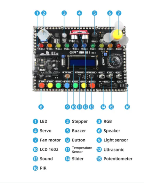 OSEPSTM Stem Kit 1 will teach you the eight most commonly used inputs and outputs in the Arduino environment. Once you have mastered these features using our OseppBlock IDE, you can smoothly program with Arduino IDE without the need for graphic "block" support.