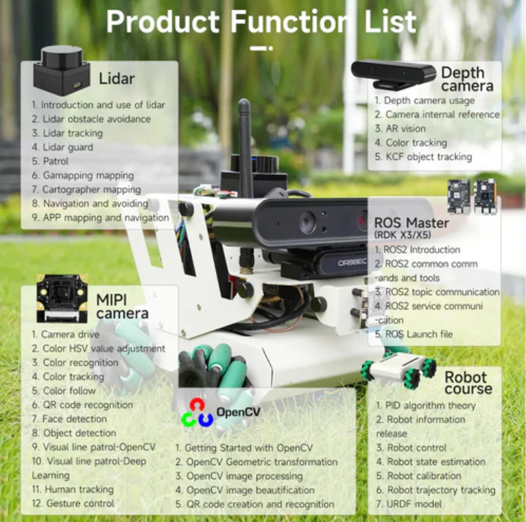 The RDK X5 development board is equipped with the ROS2 operating system, endowing this AI vision car with excellent functionality and maneuverability. The RDK robot car adopts a Mecanum wheel design, which can move flexibly and freely in various environments. The combination of its depth camera and LiDAR enables it to accurately identify and track targets, achieving intelligent navigation and obstacle avoidance functions. Through Jupyter Lab Python programming and deep learning algorithms, the car can recognize, classify, and analyze surrounding scenery in real-time, thereby achieving higher levels of intelligent decision-making and interaction.