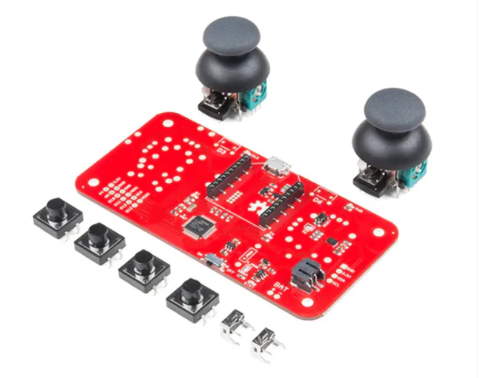 • The kit comes with a SAMD21 and requires assembly and the addition of an XBee and Li-ion battery in the provided socket. It can be configured with dual joysticks for enhanced remote control steering, suitable for robots such as tanks, or with a single joystick and four 12mm momentary buttons, reminiscent of old-school game consoles. The kit includes a built-in LiPo charging IC (MCP73831) and a fuel gauge (MAX17043). Comprehensive assembly instructions and a tank steering motor controller tutorial are provided to assist the user.
