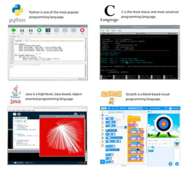 • This is a Raspberry Pi starter kit compatible with the Raspberry Pi 400 4B/3B+/3B/3A+/2B/1B+/1A+/Zero W/Zero. It contains 300 components for learning electronics and application programming. The SunFounder Da Vinci Raspberry Pi Starter Kit contains four programming languages: Python, C, Scratch, Nodejs, and Java (Processing System).