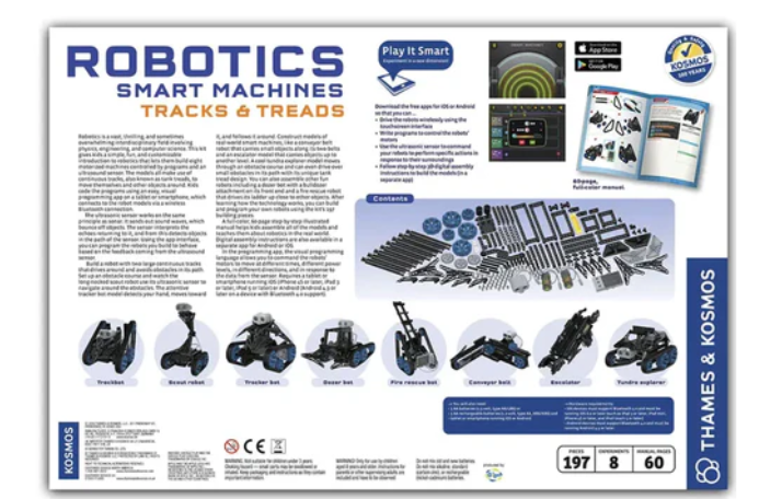• Thames & Kosmos Robotics: Smart Machines Tracks and Treads focuses on motorized machines that utilize continuous tracks (also known as tank tracks) to move themselves and other objects. The models are controlled by programs and ultrasonic sensors, so in addition to building the machines, you'll learn how to write the programs yourself using the included visual programming app on your tablet or smartphone!