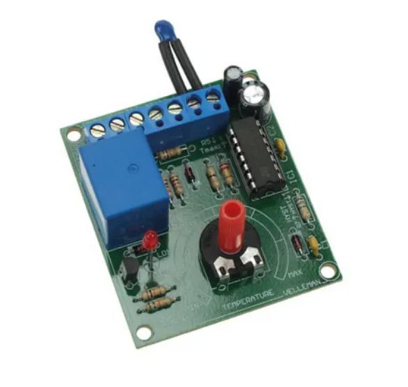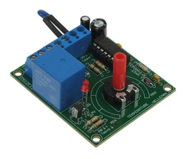• The Velleman thermostat soldering kit is a versatile, low-cost thermostat with an NTC temperature sensor. It has an output relay with an LED indicator. The kit comes with a 12V DC/100mA power supply.