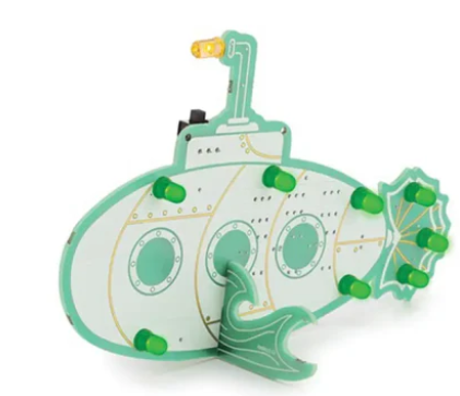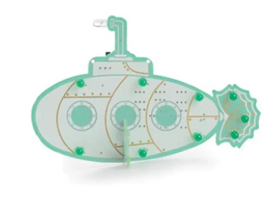 The Whadda Retro Submarine Educational Soldering Kit (WSL223) is an educational DIY project that requires soldering. Soldering is a technique used to connect electronic components. Soldering this kit is easy and fun, and you will learn more about electronics in the process. When you are finished, the LED on the kit will light up and you will have a neat little tool. This particular kit is shaped like a Jules Verne style submarine and can be hung by the small mounting holes on the top, or it can stand on its own.