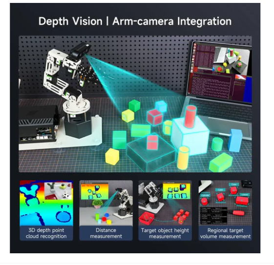 Combined with a high-performance 3D depth camera, DOFBOT-PRO can not only realize environmental perception, object recognition and other functions, but also perform accurate three-dimensional spatial positioning according to the target RGB data, position coordinates and depth information, and combine RGB+D fusion detection to complete complex visual recognition and grasping tasks.