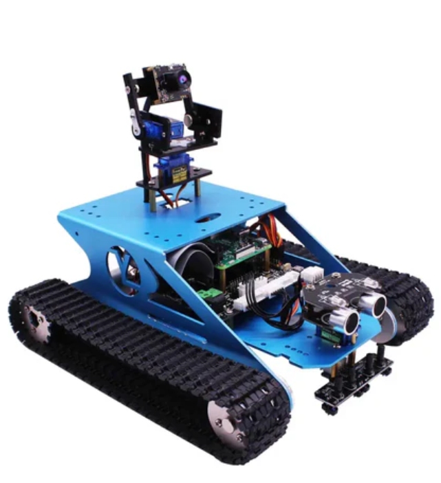 The whole vehicle adopts a 2mm thick blue aluminum alloy frame, which is installed simply and firmly, easy to assemble, with rich hardware configuration and strong circuit compatibility. The BST 4WD multifunctional expansion board is equipped with various sensors and communication module interfaces, allowing the Raspberry Pi Tank smart car to have diverse playability, supporting various basic functions such as high angle climbing, tracking, obstacle crossing, etc. It also has new AI visual gameplay, such as face detection/face tracking/color recognition/color tracking/object recognition/QR code recognition and movement. Android/iOS phones can control the car and camera gimbal through Bluetooth apps; 5G high-definition video FPV real-time image transmission, flexible control of camera pan tilt up and down rotation, Bluetooth+WiFi dual communication, no need for pairing to connect. Supports multiple remote control methods for Android/iOS apps, PC upper computers, and PS2 controllers to meet different control needs. Massive data and sample programs are available for reference.