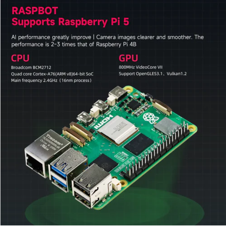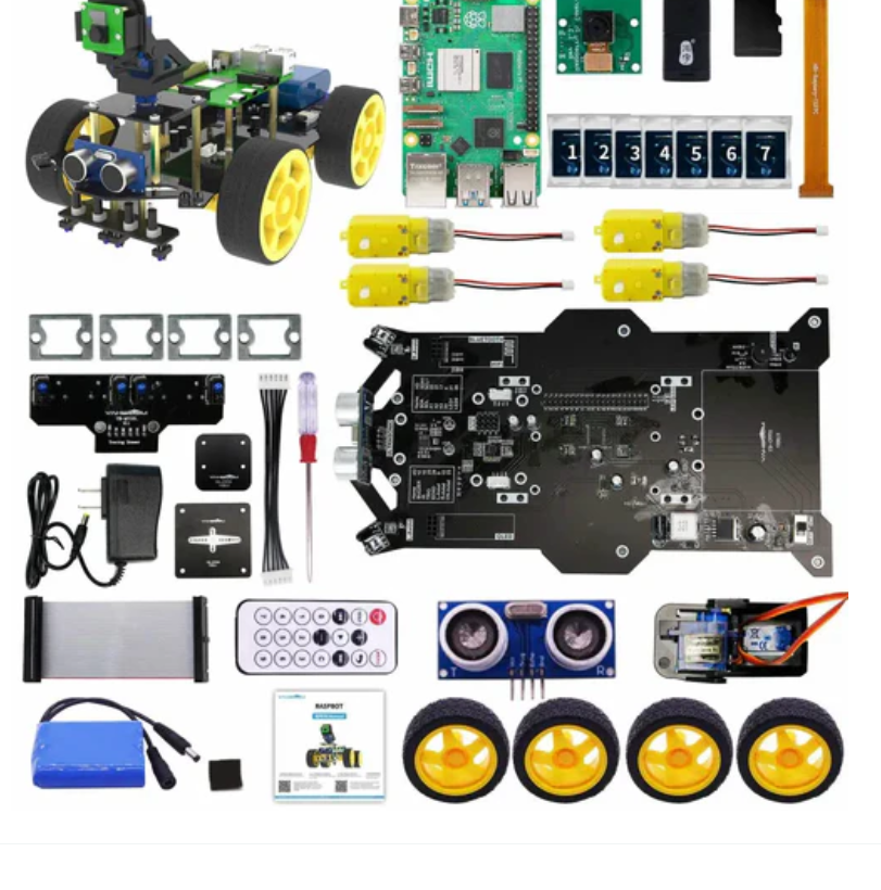 Raspbot is a robot designed for beginners in artificial intelligence to learn artificial intelligence at the lowest cost. It is suitable for Raspberry Pi 5 development board, with a multifunctional expansion board as the chassis, equipped with four TT motors, one high-definition camera, four channel tracking, ultrasonic module, etc. It can be used as a remote control car or an artificial intelligence learning kit. Like other smart cars on the market, it can perform ordinary tracking, ultrasonic and infrared obstacle avoidance, horn sounding and other functions. Unlike other smart cars on the market, we have created a series of artificial intelligence visual functions for Raspbot based on Open Source CV through Python 3 programming. Users can control this robot car through the APP, IR, and Jupter Lab web to enjoy the FPV visual experience.