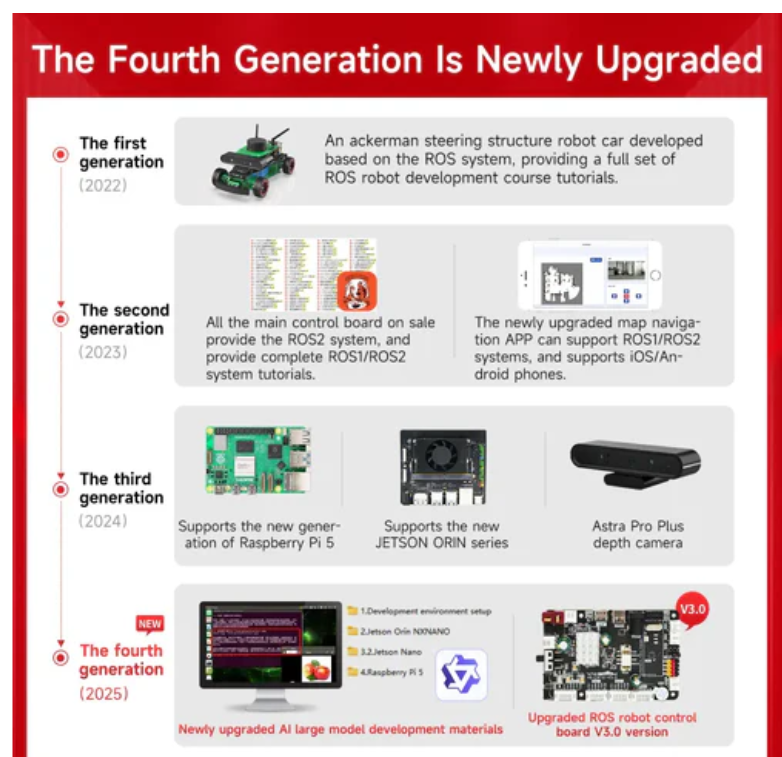1. Rosmaster R2 has 3 versions (Standard, Superior, Ultimate) that can be used with 4 development boards (Raspberry Pi 5, Jetson Nano 4GB, Jetson Orin NANO, Jetson Orin NX)