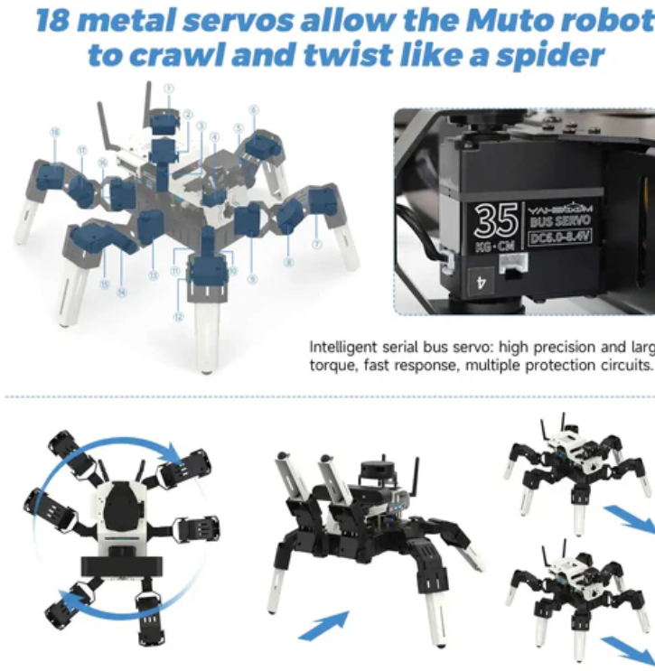 Muto is a desktop level biomimetic hexapod robot with an aluminum alloy body, 18PCS 35KG metal servos, and exquisite structural design that enables it to perform various simulated actions with astonishing flexibility and diversity. With the help of Raspberry Pi or Jetson Nano as the main controller, Muto can complete various functions such as color recognition, following, face tracking, QR code recognition, visual inspection, etc. through Python 3 programming. Users can control it through a mobile app, wireless controller, and computer web buttons, which can transmit real-time videos captured by the camera to their phone. Muto robots are an ideal companion for exploring technology, engineering, and programming.