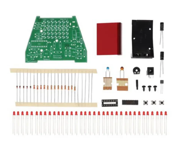 The Scrolling Message Soldering Kit is a graphic display module with 35 LEDs. The display can show up to 16 characters with adjustable scrolling speed.