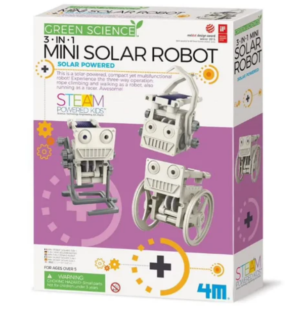 4M Green Science 3 in 1 Mini Solar Robot Kit (French) is a solar, compact multi-functional device. This extraordinary 3-in-1 mini solar robot provides an fascinating educational experience. It runs in three different ways: it can climb ropes, walk as a robot, and run when configured as a racer.