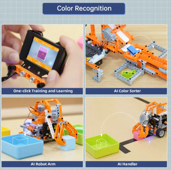The AI color sorter uses an AI vision module for color recognition, with color 1 being placed on the left and color 2 being placed on the right.