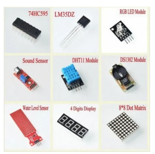 It also integrates a sound detection module, a temperature and humidity module, and a water level detection module to enable users to engage in environmental monitoring projects. In addition, the kit includes a 4x4 keypad module and an 8x8 dot matrix module for input and display. This comprehensive kit is ideal for beginners and hobbyists who want to gain hands-on experience in electronics and programming.