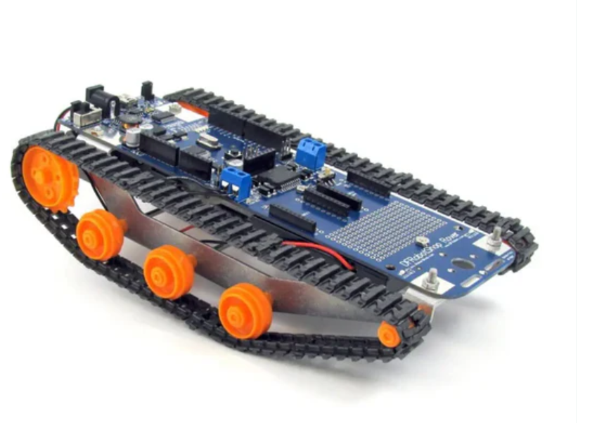 DFRobotShop Rover V2- Arduino compatible tracked robot (basic kit) is a multifunctional mobile robot tank based on the popular Arduino Uno R3 USB microcontroller. Rover uses the popular Tamiya dual motor gearbox and Tamiya track and wheel sets. The DFRobotShop Rover PCB includes a standard Arduino Uno (surface mount ATMega328), L293B motor driver (connected to pins 5 to 8), voltage regulator, and prototype area, all of which contribute to the mechanical structure of the robot. The onboard voltage regulator allows the entire circuit board to be powered with voltages as low as 3.7V to~9V *.
