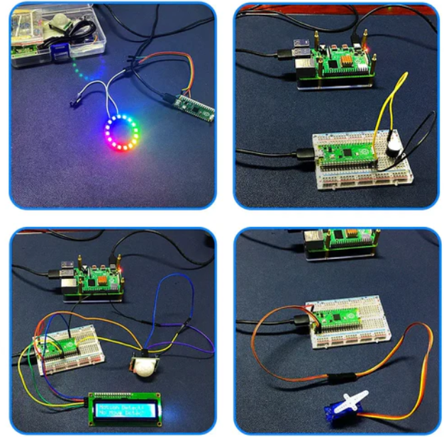 The GEEEKPi Raspberry Pi Pico Starter Kit (MicroPython) is a complete kit for hobbyists who want to enter the world of microcontroller-based devices. The kit is powered by the Raspberry Pi Pico, a powerful development platform with 2MByte of flash memory and an RP2040 microcontroller. It comes with a variety of commonly used sensors, including a PIR sensor for motion detection, a bright multi-color LED set, and a buzzer for audio feedback. It also comes with a 9g servo that can rotate 180 degrees, 16 RGB WS2812 light rings to create colorful light effects, and a Max7219 32 x 8 matrix for displaying information.