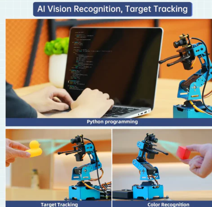 Combining high-definition cameras with OpenCV library to achieve target object recognition and localization, as well as AI applications such as color classification, target tracking, and intelligent stacking