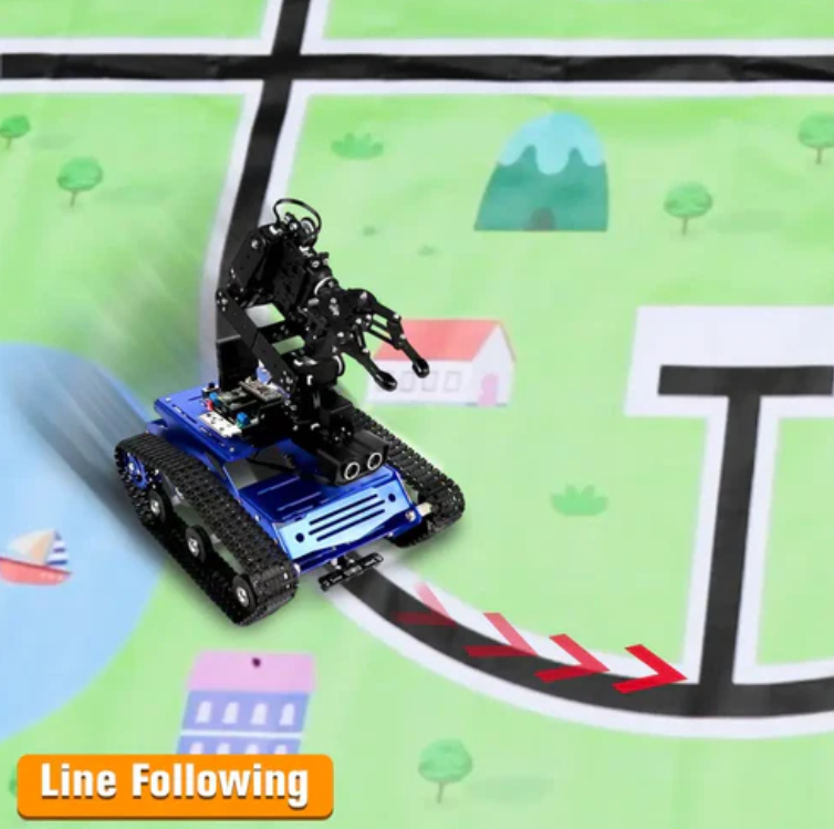 The Hiwonder Tankbot tracked robot vehicle (with a robotic arm for STM32 programming) is an intelligent handling robot driven by an STM32 microcontroller. It is equipped with a robotic arm with six degrees of freedom and uses intelligent serial bus servo. Tankbot can be controlled through the use of applications, controllers, or motion sensing gloves.