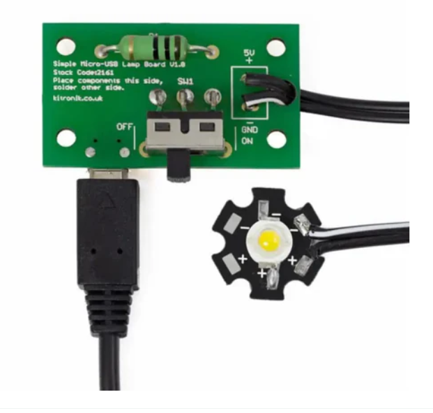 • The Kitronik Micro USB 1W LED Lamp Soldering Kit allows you to create an affordable lamp that can be powered by a standard Micro USB mobile charger (sold separately). Previous versions were configured using a breakout board. The V2.0 comes with a specially designed main board. As a result, the kit is compact and easy to build.