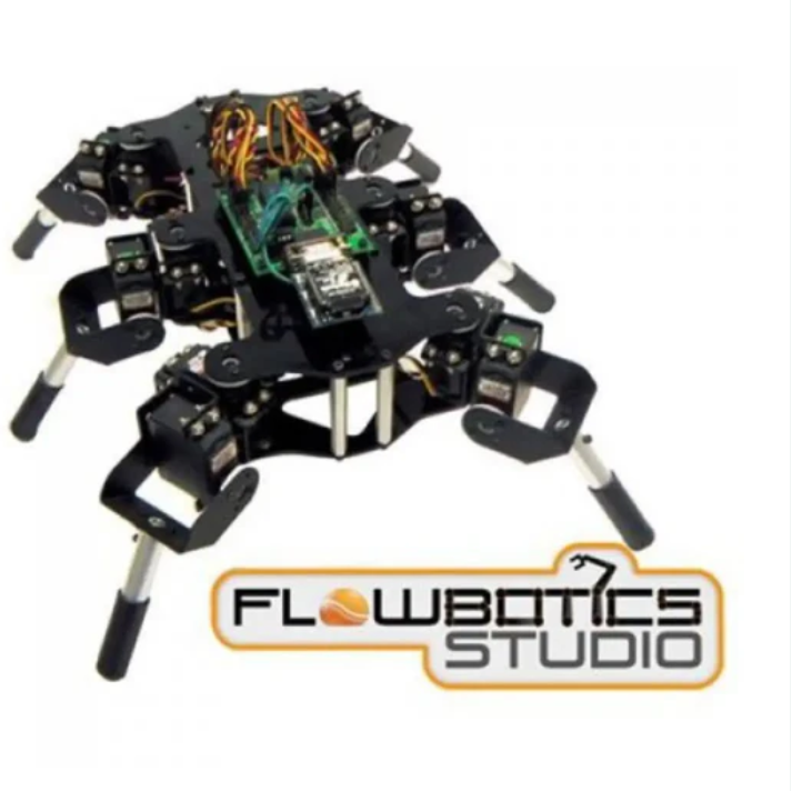 The Lynx Mini Hex hexapod robot kit MH2F (FlowBotics Studio) is a multifunctional 12DoF hexapod walking robot. This kit includes the complete version of FlowBotics Studio, including SSC-32, serial to Bluetooth board, and Bluetooth module, which can be remotely controlled from a computer. This method transfers advanced computing to computers. FlowBotics Studio includes an MH2 demonstration project with pre written walking algorithms. The hexapod robot is designed around simple mechanical legs, with all metal brackets. This leg design minimizes the number of parts required to make two degrees of freedom (DOF) legs, allowing the robot to operate like a tank. Supports forward, reverse, and stationary turning. The robot's legs use standard sized Hitec servers. The combination kit includes everything needed to make a functional robot, except for the battery and optional PS2 controller. Mechanical structure hexapod