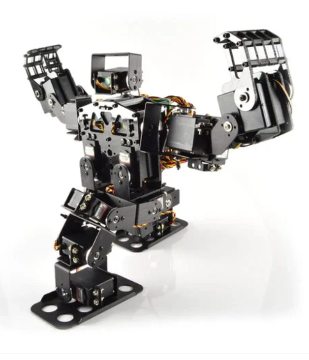 Lynxmotion Pete humanoid robot development platform (hardware only) is a 22 DoF R/C servo bipedal walker with a default configuration of gripper. This allows Pete to walk forward or backward, turning left or right in place at a variable speed. The leg design is similar to that of humans. Pete has five degrees of freedom for each leg, five degrees of freedom for each arm, and two degrees of freedom for the head. It is worth noting that Pete is currently a research platform that requires users to create their own walking algorithms and complete electronic devices to achieve remote control or autonomous functions.