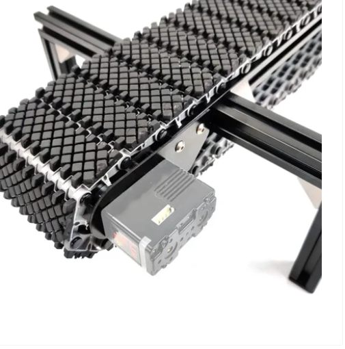 • The frame of the conveyor is made of aluminum extruded parts and composite G10 board. The friction top (rubber pattern) modular track segment helps ensure that the product stays on the conveyor, while the drive and idler sprockets always maintain track alignment.