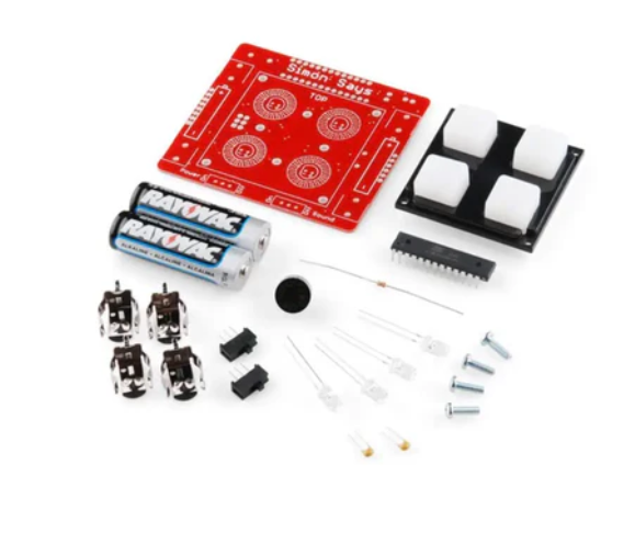 • Simon Says - A few modifications made to the through-hole soldering kit make it easier for beginners to build. All components are through-hole, making this kit ideal for starting to learn soldering. When you build this kit, you will have the opportunity to solder a 28-pin microprocessor, LEDs, battery clips, and more.