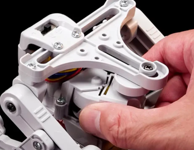The robot is composed of light gray plastic components. The leg and plastic slide rails are designed with holes that can be connected to other components such as universal shafts, arms, and other original parts using self tapping screws. This allows customization of the appearance of the robot. The assembly of the robot is very simple, using a buckle/screw connection design. The assembly difficulty level is 3 out of 5, and the estimated assembly time is 120 to 180 minutes.