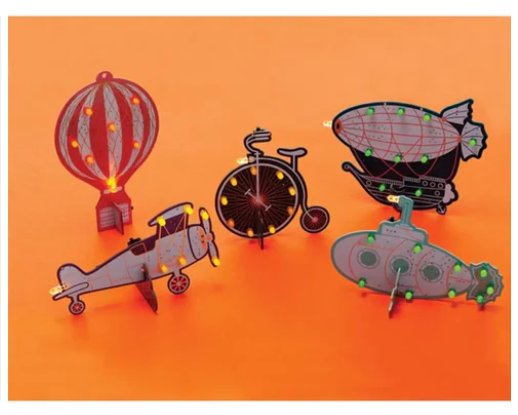 The second kit is designed in the shape of a Jules Verne-style bicycle and can also be hung using the small mounting holes on the top or stand alone. It features a unique brown print and comes with multiple yellow LED lights, and a warm candle-flashing LED light on the top.