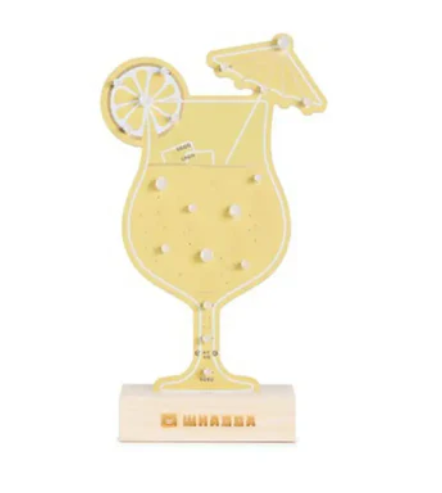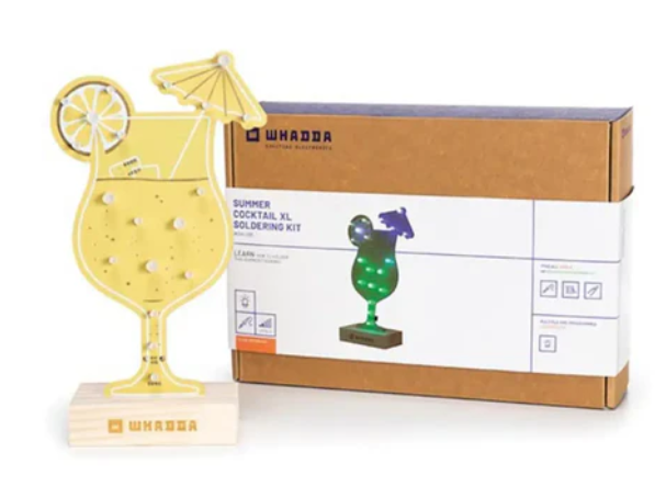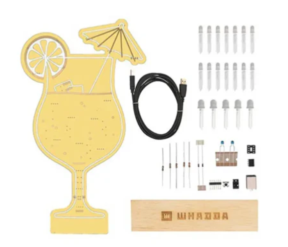 The Whadda Summer Cocktail XL Soldering Kit (WSXL105) features decorative RGB LEDs with special diffusion effects. Once soldered, the LEDs will provide five different light effects. The built-in ATtiny chip is pre-programmed with some basic LED effects, so you only need to power it with the included adapter and the kit will work.