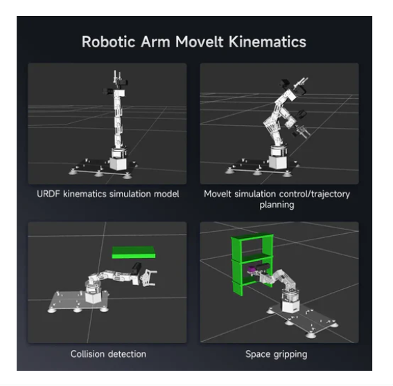 • The entire robotic arm body is made of high-quality aluminum alloy, with six flexible degrees of freedom. Each joint uses high-precision servos, which have faster response speed and can perform smooth multi-axis movement.
