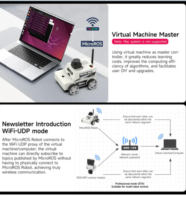 The MicroROS control board is equipped with ESP32, which utilizes MicroROS's WIFI UDP function to achieve remote communication between the car and the PC virtual machine.