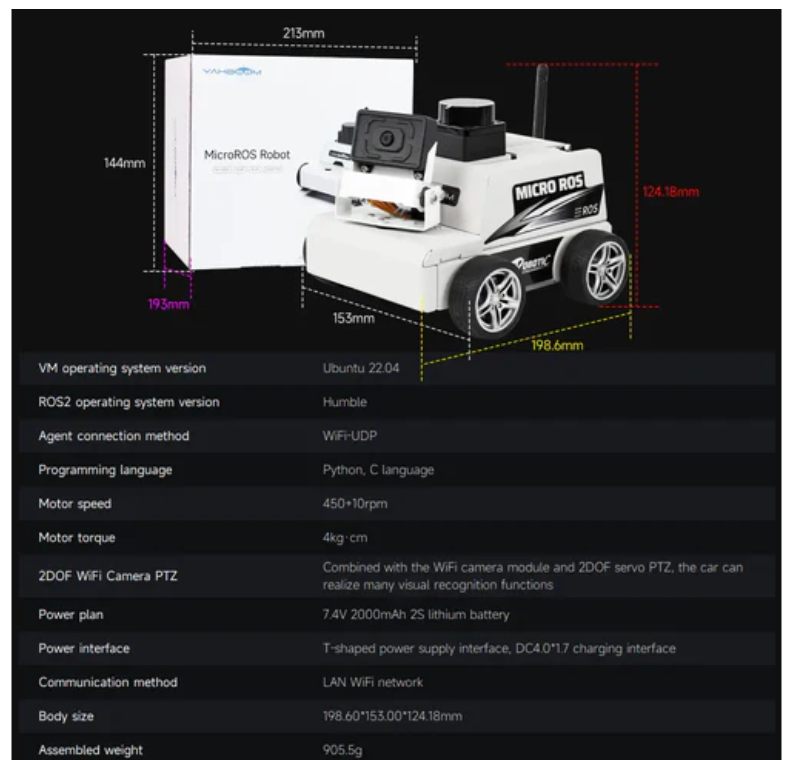 This ROS educational robot car migrates complex computing tasks to a PC virtual machine environment without the need for an embedded development board (Jetson NANO/Raspberry Pi) as the main controller. The data and information generated by the car are remotely transmitted to the PC virtual machine system by the ESP32 coprocessor through MicroROS's WIFI UDP function, completing calculations and generating decisions. Yabang Technology provides 4PCS 310 encoded motors, 7.4V large capacity batteries, professional MicroROS control boards, TOF LiDAR and other accessories, combined with ROS2 Humble operating system and Python3 programming to help achieve functions such as obstacle avoidance, following, mapping navigation, RVIZ simulation, and multi machine synchronization control.