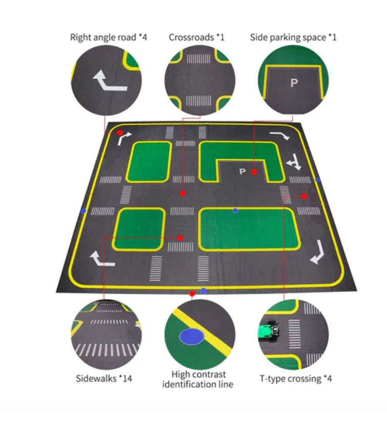 • This high-quality map is made of high-quality waterproof canvas and UV printing technology. Compared with other track maps, it has bright colors and is easy to restore after folding. With a size of up to 3.2M * 2.8M, it is suitable for professional robot racing competitions or programmable intelligent car daily autonomous driving model training. In addition, we also provide traffic signs (with a height of 18cm) and traffic lights (with a height of 24cm), which can simulate traffic scenes in real life, allowing cars to achieve autonomous driving while completing traffic light and road sign recognition.
